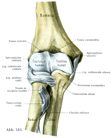 滑車の内側縁も一種のラセンをえがく(Fick).滑車は外側方では,傾斜した縁と個体的に深さの異なる溝とによって小頭とへだてられている.軟骨は1.5mmの厚さである.軟骨は内側縁で最もうすく(1.2mm),外側縁では2mmにも達する.肘頭窩のすぐ下方では最も薄い.滑車の外側縁では軟骨が疎になり,ほぐされたようになり,あるいはところによっては全く欠けている(Fick)-図416を参照せよ.