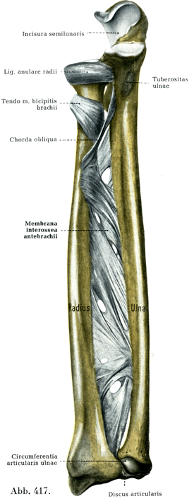 前腕の両骨のたがいに向きあった縁,すなわち橈骨骨間稜と尺骨骨間稜のあいだに,かたい線維性の前腕骨間膜Membrana interossea antebrachiiと斜索Chorda obliquaとが張られている.