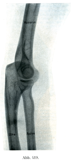 [図418, 419]肘関節27才の処女の腕のレントゲン像. 図418は掌側から背側へ照射,図419は尺側から橈側へ照射.