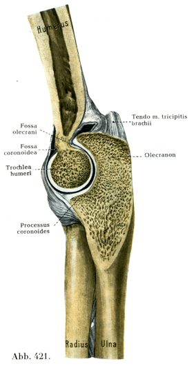 [図421, 422]右の肘関節(4/5) 図421は上腕骨滑車の軸に垂直な面で切断し,その外側半を内側からみたところ.図422は肘関節を前方からみたところ.
