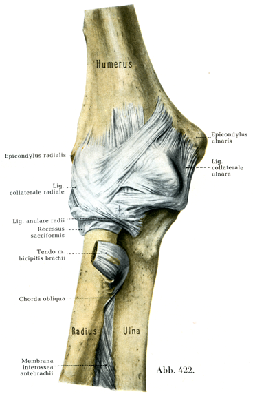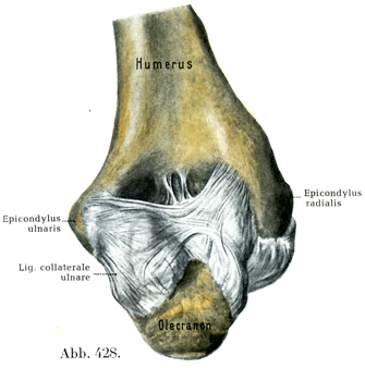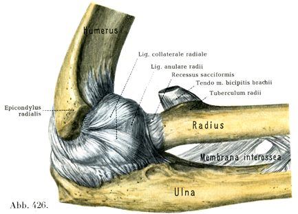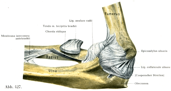 特別の装置としては3つの補強靱帯があるただしこれは関節包および焼側側副靱帯と結合して分離できない橈骨輪状靱帯Lig. anulare radiiをもいっしょに算えてのことである.他の2つの補強靱帯が尺側および橈側側副靱帯である.尺側側副靱帯Lig. collaterale ulnareは上腕骨の尺側上顆から起って,その線維は扇状に尺骨に向って放散している.