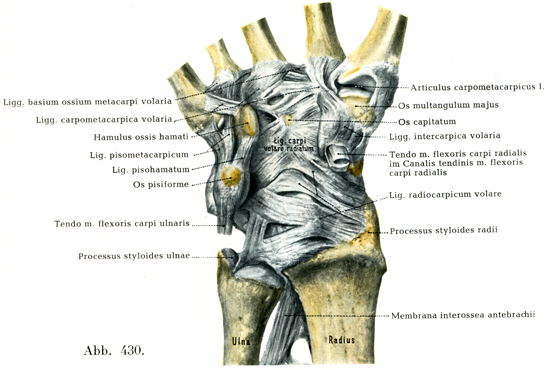 特別の装置としては背側に1つ,掌側に2つの補強靱帯がある.すなわち背側橈骨手根靱帯Lig. radiocarpicum dorsaleは橈骨から起って斜めに遠位尺側方に走り,三角骨の背面に付く.また掌側橈骨手根靱帯Lig. radiocarpicum volareは前者よりはるかに強い靱帯で,橈骨の茎状突起と税骨の遠位縁から起る.この靱帯は幅のひろい隙間によっていくつもの部分に分れており,それらが斜めに遠位尺側方へ走って,月状骨・三角骨ならびに有頭骨・有鈎骨に付藩している.最後に堂側尺骨手根靱帯Lig. ulnocarpicum volareは尺骨の茎状突起の基部と,関節円板の掌側縁から起り,三角骨と月状骨に付く(図430).