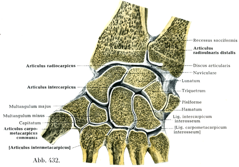 この関節をつくっている骨(図430~432)は大および小多角骨・有頭骨・有鈎骨・第2~5中手骨である.