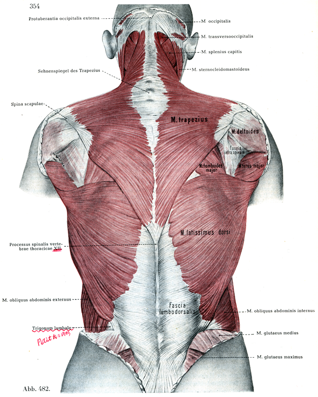 これは比較的薄い筋であって,直角三角形の形をして背の下部を被っている.この筋は,上部では僧帽筋に被われて下部5~7胸椎の棘突起,腰背筋膜,腸骨稜の後部および下部3~4肋骨から起る.筋線維は,横及び外側上方に向い肩甲骨下角を越えて上腕骨に向って走り,扁平な腱となって大円筋を前方に回り小結節稜に付着する.