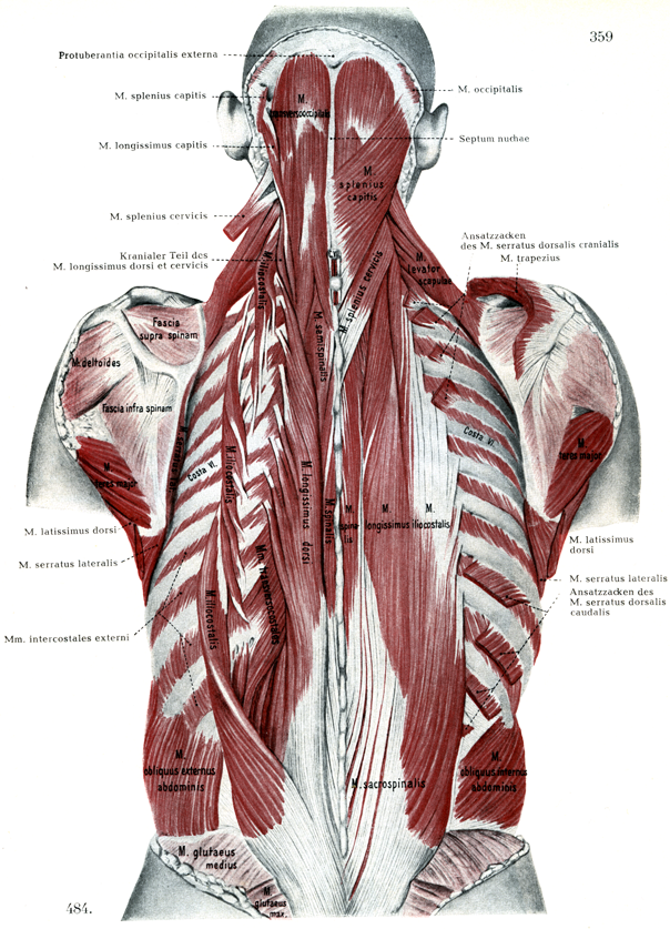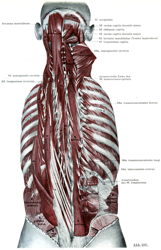[図485] 長い背筋群(左は表層の諸筋のあいだを分けてある;右はいっそう深部の筋),深部の項筋群(右).