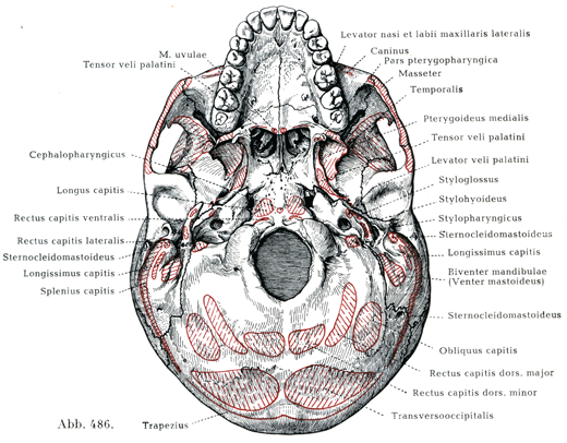 e)外側頭直筋M. rectus capitis lateralis. この筋は環椎の肋横突起前弓より起り,後頭骨に後頭顆の外側(乳様傍突起Processus paramastoideus)で付着する.