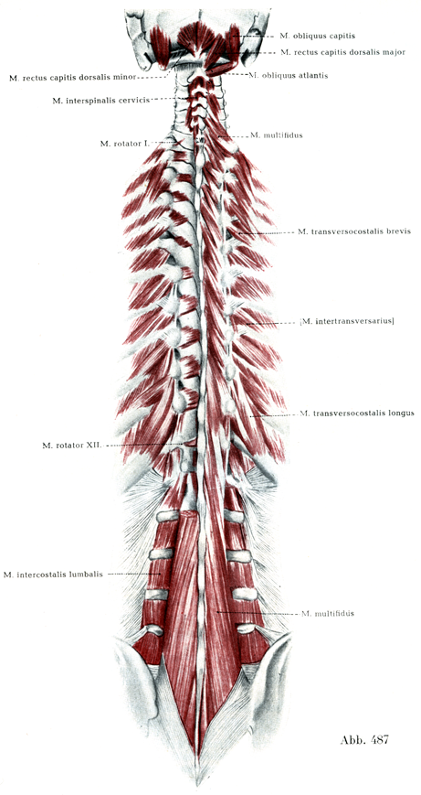 この筋は横突棘突筋系transverso-spinales Systemの強大な第2層をなしている.半棘筋が存在する範囲では,この半棘筋が横突棘突筋系の浅層を成して多裂筋を被っている.多裂筋はいっそうゆるやかな傾斜をして走ることによって半棘筋と区別され,仙骨の後面から軸椎にまで延びている.これは羽を組み合せたような構造になっている.