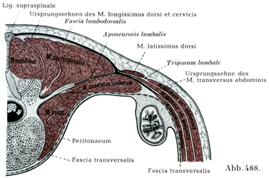深葉tiefes Blatt, すなわち腰腱膜Aponeurosis lumbalisは仙棘筋の腹側,腰方形筋の背側にあり,最下部の肋骨,腰椎の肋骨突起および腸骨稜のあいだに張っている.この筋膜から内腹斜筋および腹横筋が起る.最長筋および腸肋筋の下方の尖頭はこの筋膜に付着する.外腹斜筋の1頭はこの筋膜から起ることがある.この筋膜の内側部には普通多くの裂溝状の隙間がある.
