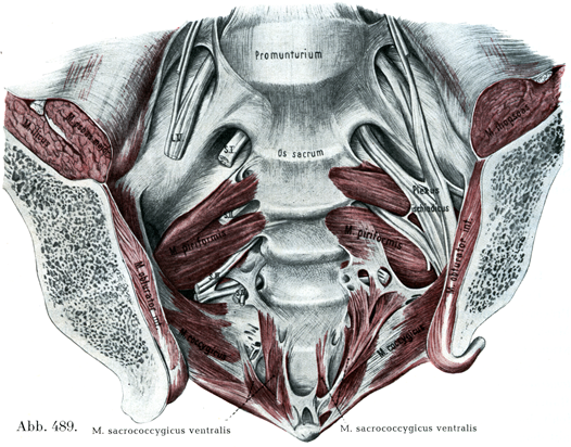 [図489] 腹側の尾骨筋群 骨盤を前額断してその背方部を前よりみる(P. Eislerによる).