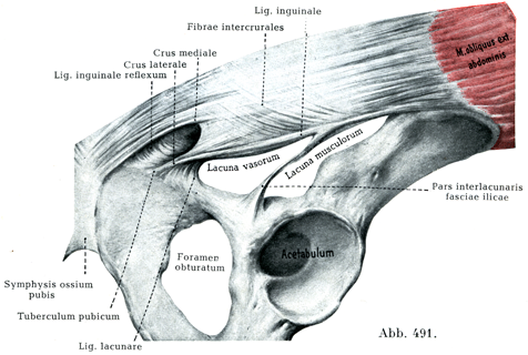 鼡径靱帯の線維の一部は恥骨結節に達することなく,(直立姿勢では)水平位をとる小さい三角形の腱板となって恥骨櫛の内側端と恥骨筋膜とに付着している,これが裂孔靱帯Lig. lacunareである.その外側の自由縁は鋭くとがり,しかも側方に向って軽く凹んでいる(図491).