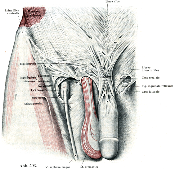 恥骨の前面に付着する腱線維と恥骨結節にいたる腱線維とのあいだに1つの重要な間隙がある.すなわちこれが浅鼡径輪Anulus inguinalis subcutaneus, äußerer Leistenringであるこの輪の内側の境は浅鼡径輪の内側脚Crus mediale,外側の境は外側脚Crus lateraleといわれる.両脚の停止部のあいだにあって背方の境をなしているものが反転鼡径靱帯Lig. inguinale reflexumであって,これは溝状のへこみをもつ線維束である.浅鼡径輪の外側のすみに円みをつけている線維束は脚間線維Fibrae intercruralesという名でよばれている(図491, 492, 493).