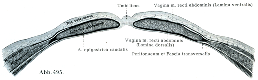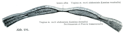 腹直筋の直ぐ外側縁で内腹斜筋は完全にその腱膜に移行している.腱膜はそこで前後の2葉に分れて腹直筋を包んでいる(図494).前葉は全長にわたって外腹斜筋の腱膜と癒着し,かくして腹直筋鞘の前壁を補強している.これに反して後葉は臍の約5cm下方にある横の1線あるいは下方に凹の1線をなして終っている.これを半環状線Linea semicircularisとよんでいる(図492).腹直筋の内側縁,すなわち白線において腱膜の前,後両葉はふたたびたがいに合している.