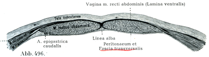 前腹壁および側腹壁の筋肉は斜走,横走および縦走するもの,すなわち腹直筋,錐体筋,内と外の両腹斜筋,腹横筋からなっている.側腹壁から起って斜走する筋と横走する筋とは幅の広い腹筋breite Bauchmuskelnといわれる.幅の広い腹筋はやはり幅の広い終止腱,すなわち腱膜Aponezarosenに移行し,この腱膜は長い筋に対して鞘を作り,前正中線で相合している.前正中線で相合するところに縦走する腱性の索ができていて,白線Linea alba, weiße Bauchlinieとよばれ,これは剣状突起から恥骨結合に延びていて,腋のところでは瘢痕形成によって閉ざされた臍輪Anulus umbilicalis. Nabelringをもっている.