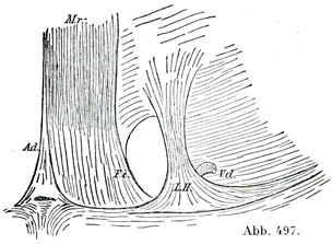 [図497] 右の内側鼡径窩とその周囲, 内部(後方)から解剖したもの Ad. 白線補束;Mr. 腹直筋;V. d. 精管および腹膜下鼡径輪;F. i. 鼡径鎌;L. H. 窩間靱帯. F. i. とL. H. との間に鼡径窩が明るい卵円形として示されている.(BrauneおよびHisによる)