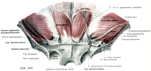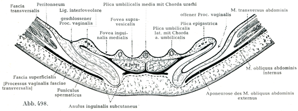 窩間靱帯の内側縁と鼡径鎌の外側縁とのあいだにある腹横筋膜の薄い部分(図497で明るい卵円形の部分として画かれている)は内側鼡径窩に一致している.ここが直接鼡径ヘルニアdirekte Leistenbrücheが出てくるところである.下腹壁動静脈は内方から窩間靱帯を被い,あるいは鋭い角をなしてこれと交わっている.