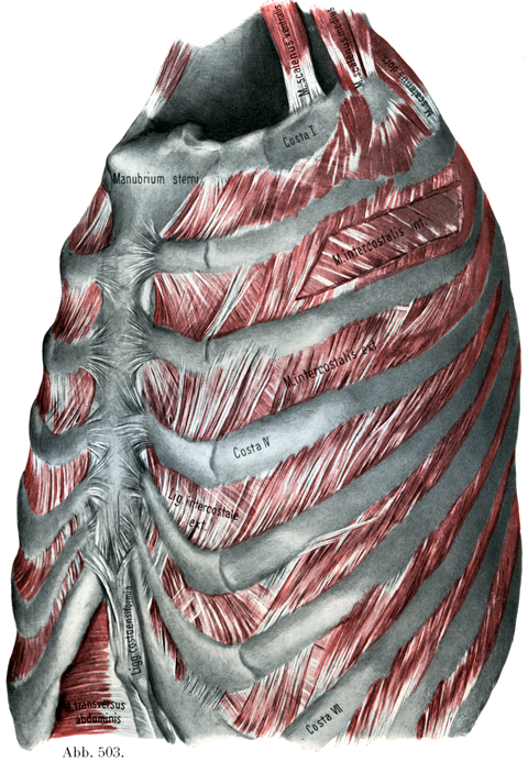 肋間筋群の作用はすでにしばしば研究されてきたが,しかしその判断はまちまちである.この論争をGalenusにまでもさかのぼると,それ以来実に1700年以上を経ている.--R. Fickによれば肋間筋群の作用は次のものであるという.すなわち静かに呼吸しているときには,吸気は外肋間筋と肋軟骨のあいだの筋によって起り,呼気は内肋間筋によって起るのであって,呼気が胸郭の弾性“Elastizität des Brustkorbes”によるというようなことはない.(肺を含まない)胸郭の平衡位としては吸気の状態がそれであり,呼気のそれではない(Arch, Anat. Phys.1897およびHandbuch, 3, Bd.,187頁).しかし私(Kopsch)は,内と外の両肋間筋がおそらくいつもいっしょになってはたらき,しかも吸気のときにも,呼気のときにも作用することを信じている.