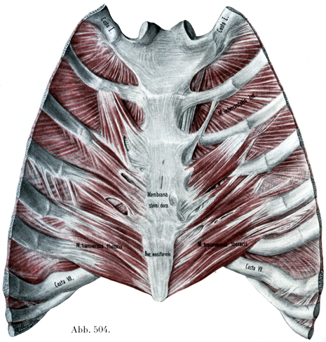 その線維は外側ならびに上方に走って次のように散開している,すなわち下方の線維は水平に,中間のものは斜め上方に,上方のものはほとんど縦の方向に走っている.これらの線維は(5個の)尖頭に分れて第2~第6肋軟骨の下縁でその肋硬骨との移行部に固く着いている.最下の尖頭の線維は腹横筋の線維に平行に走り,後者の胸郭の内壁につづく部分が胸横筋なのである.