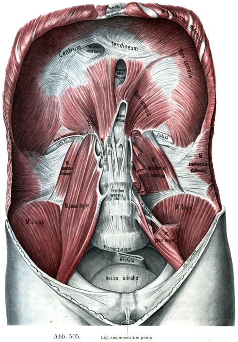 [図505] 横隔膜および寛骨内部の筋 左:大腰筋の起始尖頭を解剖してある,かくして腰方形筋の大部分がよくわかるようにしてある.