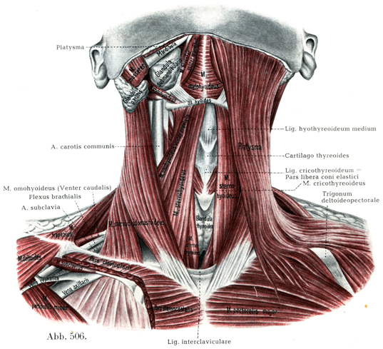 [図506] 頚筋と舌骨上筋I(11/20) 左:表層, 広頚筋を残してある,右:表 層, 広頚筋を取り除いてある.