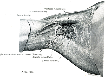 腋窩筋膜は大胸筋と広背筋とのあいだに広がる弓状のかなり強い線維の流れをなし,これはランゲル腋窩弓Arcus axillaris, Langerscher Achselbogenと呼ばれている,第2の弓状線維束は腋窩の上外側の境にあって,その凹面を体幹の方に向けており,上腕弓Arcus brachialisと名づけられている.両弓(腋窩弓と上腕弓)の間にある卵円形の場所は筋状に孔のあいた腋窩筋膜のはなはだ疎な部分,すなわち腋窩篩板Lamina cribriformis axillaris(Eisler)であり,そのずきまは脂肪組織で満たされ,血管・リンパ管・神経が通っている(図507).