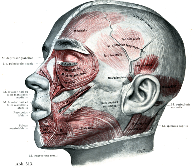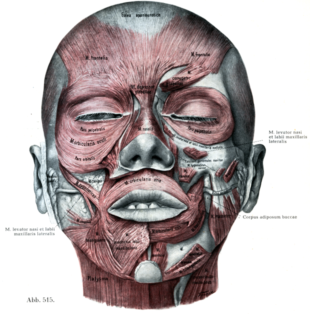 顔面の表情筋の作用には大きい個体差がある.それは次のような物質的な基礎にもとついているにちがいない.すなわち筋の大いさおよび練習によってえられた能力によるといえるが,そればかりでなく,筋の停止,他の筋との続きぐあいなどによっても制約されるにちがいない.それゆえ人の顔面筋の配列の細かさにおいて,個々の人種のあいだに違いがあることの可能性がある.H. Virchow, Arch. Anat. Phys.1908. Z. Ethnologie 1910.-H. v. Eggeling, in L. Schulze, Forschungsreise Bd. III. Jena 1909.--Bluntschli, Morph. Jahrb., Bd. 40,1909.--Loth, E, Anthropologie des parties molles. Paris 1931. Wagenseil, F., Z. Morph. Anthrop., 36. Bd, ,1936.