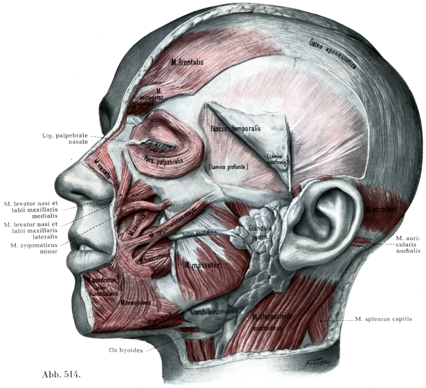[図514] 頭部の筋(II) 広頚筋耳下腺咬筋膜および眼輪筋の眼窩部を取り除いてある.側頭筋膜の浅葉は,頬骨弓ならびに前頭骨の側頭線から切り離し,その下にある脂肪層とともに上方に折り返してある.