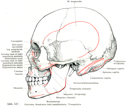 [図517] 頭部の筋の起始と停止 頭蓋骨を側方よりみる.(H. Virchowによる)