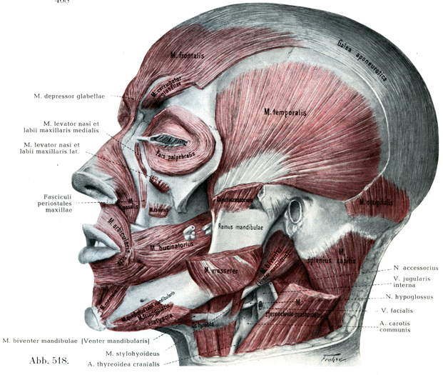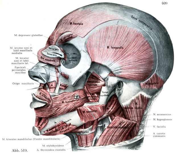 [図516] 頭部の筋(IV)および舌骨上筋 広頚筋,耳下腺咬筋膜,側頭筋の浅葉とその深葉の一部,耳下腺と顎下腺とを取り除いてある.また眼輪筋の眼窩部,笑筋を取り除き,大頬骨筋,オトガイ三角筋,眼角筋,眼窩下筋,小頬骨筋,下唇方形筋を切りとってある.