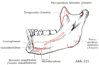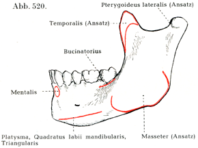 [図520]下顎骨の外面における筋の起始と停止 (H. Virchowによる).