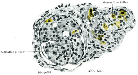 頚動脈糸球は(A. Kohn, Handbuch…Physiologie 1930)特殊(sui generis)な器官で交感神経系に属するものである.これは典型的ないわゆるクローム親性細胞と神経細胞および神経線維からなる(図637).