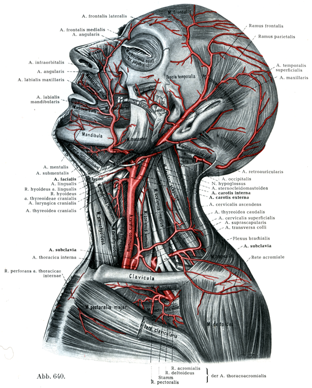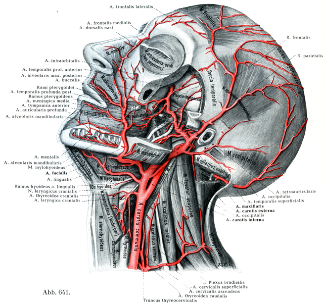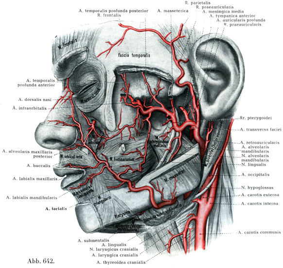 顔面動脈は舌動脈の上方で外頚動脈から出て,舌動脈と同じようにまず茎突舌骨筋および顎二腹筋の後腹の内側を顎下腺の下まで走り,この腺で被われるが,そこでは下顎体の内側にある.ついで咬筋付着部の前で下顎の下縁を曲がって顔面に出て口角にいたる.そこから鼻の側面をへて内眼角の近くに達し,眼動脈の鼻背動脈と吻合して終る.