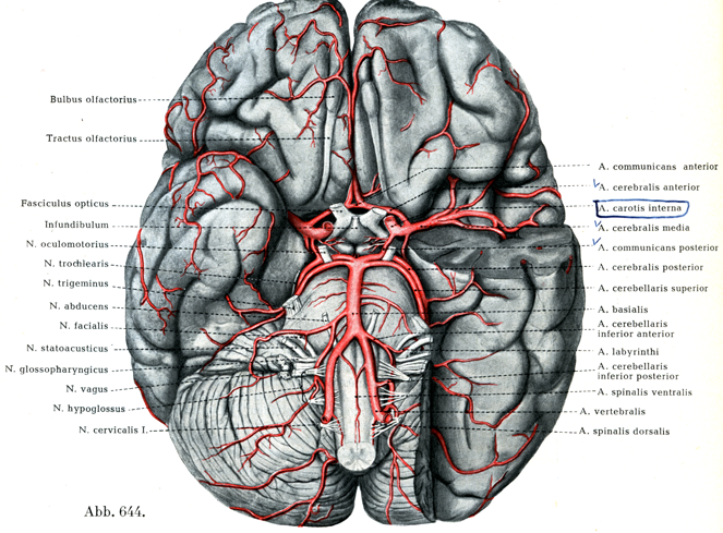 内頚動脈は脳, 眼窩の諸器官,および前頭部に枝を送る.甲状軟骨の上縁の高さにおいて総頚動脈から出て,ほとんどまっすぐに頚動脈管の外口に向い,この管のなかを通りぬけて蝶形骨の頚動脈溝にいたり,そこでは海綿静脈洞のなかにある.小翼突起の内側で脳膜を貫くが,そのさい急に後上方にまがり,そこで終枝に分れる.