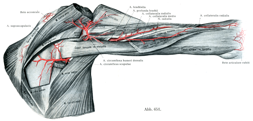 c)中側副動脈A. collateralis media.これは上腕骨の後面でまず上腕三頭筋の尺側頭と橈側頭のあいだを通り,つひで上腕骨の外面に接しつつ尺側頭の筋質の内部を肘の高さまで下行し,そこにある肘関節動脈網Rete articulare cubitiの中に入りこむ.