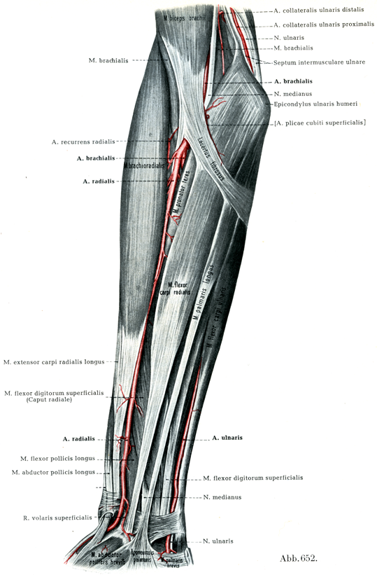 局所解剖:その走行の途中で上腕動脈は尺側上腕二頭筋溝の中を下方に走り,きわめて徐々に上腕の内側から外側の方に向う.そのすすむ方向は腋窩の中央から上腕骨の尺側上顆と橈側上顆のあいだの中点に引いたと仮定した線に一致している.肘窩の近くまではこの動脈がかなり表層を走り,その上には上腕二頭筋の縁と上腕筋膜,および皮膚が被っているだけである.肘窩では円回内筋と腕橈骨筋との間の溝に入り,上腕二頭筋腱膜Lacertus fibrosusの下にかくれる.また上方ではこの動脈が上腕三頭筋の長頭と烏口腕筋の間にあり,下方では上腕二頭筋の縁と上腕筋との間で尺側上腕筋間中隔の前にある,前腕では浅層と深層の両屈筋群のあいだにある(図650).
