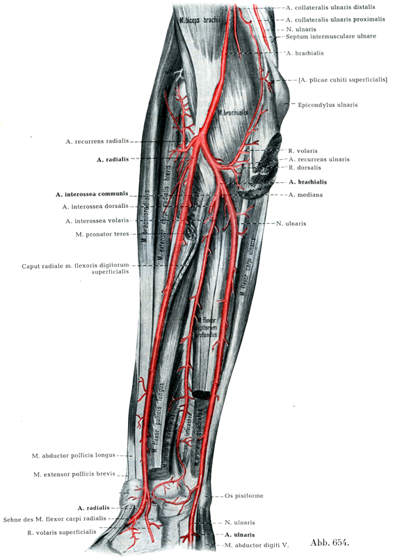 総骨間動脈は腋窩動脈または上腕動脈から出ているときには上腕動脈の後方に伴って肘窩に達する,そして前腕の諸筋の間をへて深層に入り,その正常の位置をとる.--橈骨動脈が高位で始まるときには他の幹をなす部分が正中神経に伴って尺側上腕筋間中隔に沿って尺側上顆に向かって下行し,ついで円回内筋の起始のところで外側にまがってこの筋の下にはいり,肘窩の中央でその正常の位置をとるようになる. 上腕動脈が最後に分れて生ずる2本の枝がときとして肘窩の近くで横走する1枝によってたがいに結合していることがある.この枝はだいてい強い方の動脈からいっそう弱い方の動脈に向かっていて,その太さや形および位置はまちまちである,それよりまれに初めに分れた2枝がまた完全に合して1本となることもある.迷行動脈Vasa aberrantiaと名づけられているものは,長くて多ぐは細い動脈であって,腋窩動脈か上腕動脈から出て前腕にある動脈の1つか,あるいはその枝の1つとつながるのである.Quainの観察によると迷行動脈は9例ちゅう8例まで橈骨動脈とつながりまれに尺骨動脈とつながるのである.この変異は上腕動脈に高位の分岐が起こって,かくして始まつた枝がふたたび横走する吻合枝でたがいにつながっている場合に準ずるものと云える.--たいていの例で上肢における高位の分枝は左右同じ関係にはなっていない.すなわちQuainによると上腕動脈の高位分枝を示した61個体のうち43例は左右のうち1側にだけそのことが見られ,13例では両側に見られたが,その程度が左右で違っており,わずか5例だけで左右が同じぐあいになっていた.