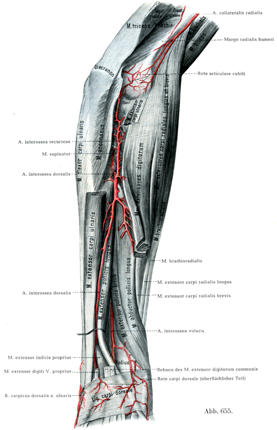 この動脈は骨間膜の近位部の隙間を通って伸側にいたり回外筋の遠位方にあらわれる.ついで浅深の両伸筋群のあいだを遠位に走り,多数の枝を伸筋群に出して,終りにはたいていは非常に細くなって手根に達する.この動脈から次の枝が出る.