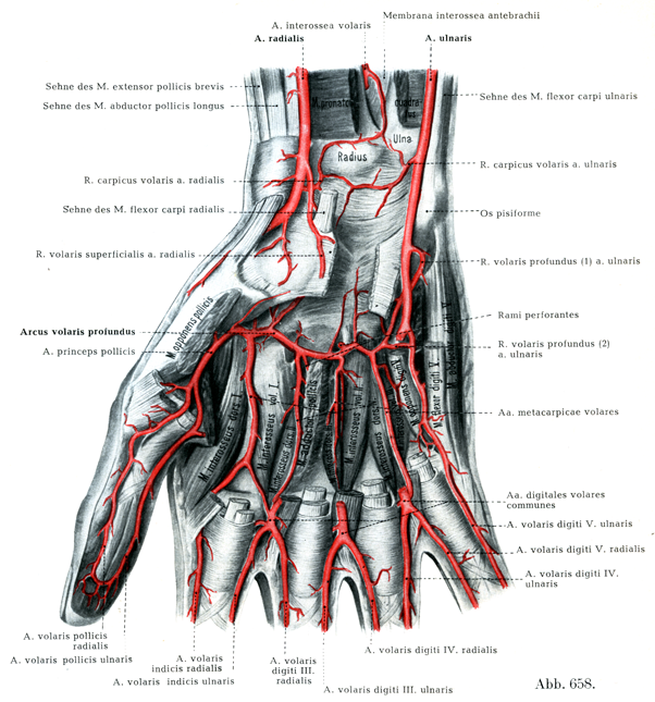 E. Zuckerkandl (1896)によると多くの例で(79%)尺骨動脈に2本の深掌枝があり,そのうち遠位のものが普通にはずっと強大である.近位の枝が欠けていることは決してない(100例をしらべて).しかし遠位の枝は21%に欠けている.近位の枝は豆状骨の近くで始まるが,遠位の枝は浅掌枝が曲がって浅掌動脈弓になるところから出ている(図658).