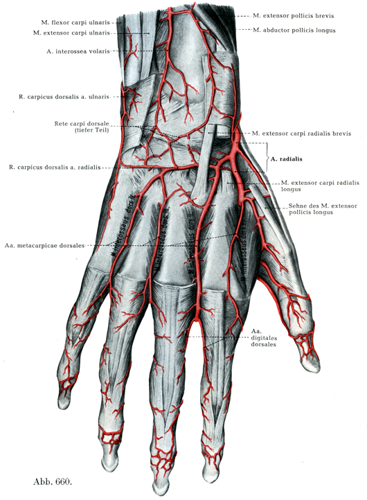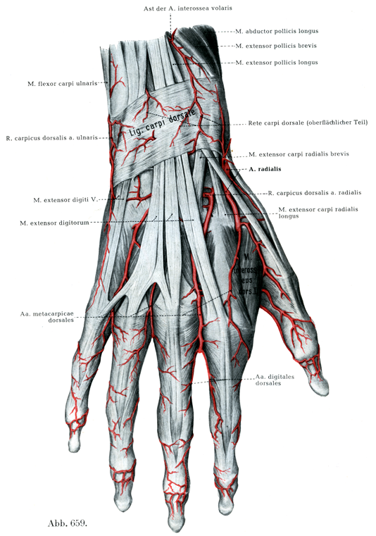 6. 第1背側中手動脈A. metacarpica dorsalis I. この動脈は第1と第2中手骨の底の近くで始まり,第1背側骨間筋の上を走って母指の背面の両側と示指の背面の橈側を養っている(図660).