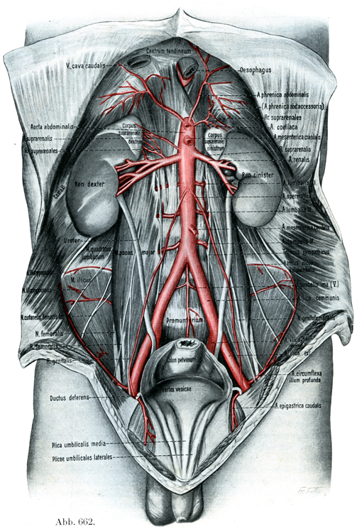 男女の差:Heidsieckによると女では腹大動脈の大きな枝の起始および“分岐(総腸骨動脈の)”が概して男の場合よりもっと下方にある(Anat. Anz., 66. Bd.,1928).