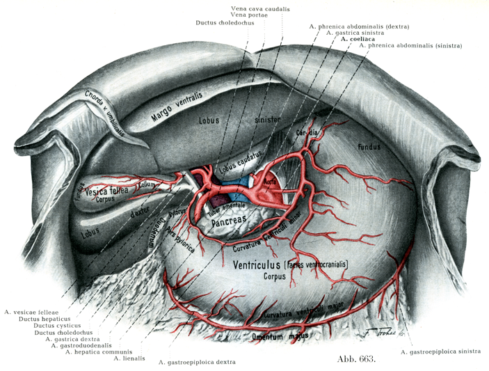 [図663] 腹腔動脈Arteria coeliacaとその枝 (3/5) 胃を少し下に引ぎ下げ,肝臓を少し上に折り返してある.