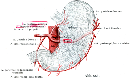 変異:ときとして左胃動脈が大動脈から直接に出ている(ヨーロッパ人では6.5%,日本人では7.5%, Adachi).ときどき重複しており,またこの動脈から第2の肝動脈が出ていることもある.