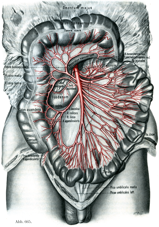 局所解剖:この動脈の前壁には少しの長さだけ膵臓が接している.膵臓の下縁からこの動脈が出て来るところで十二指腸の終りの部の前を通って小腸間膜に達し,その両葉の間にはいる.動脈の幹は両葉のあいだを軽く左方に凸の弧をなして右下方に走りながら,多数のかなり太い枝を出して次第に細くなっていく.右腸骨窩のところでこの幹の下端は右下方に曲り,幹の凹側縁から出た枝の最後のものと吻合する.凸側縁から出る枝は空回腸を養い,凹側縁から出る枝は大腸の諸部,十二指腸と膵頭の一部を養う.そのさいこれらの枝は互いの間で多数の結合をもっている.