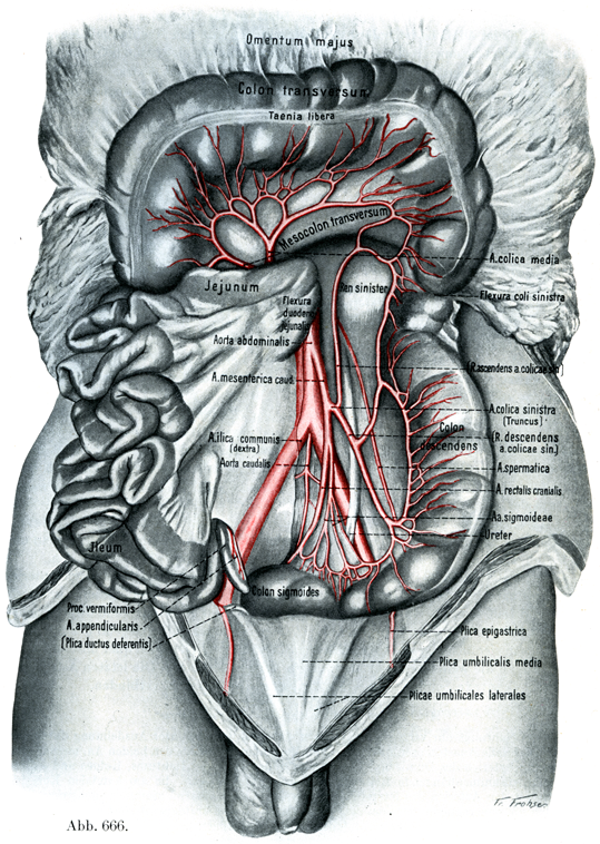 b)空腸動脈,回腸動脈Aa. jejunales, Aa. ilicae(図665).空腸と回腸を養うもので,幹の凸側縁すなわち左側から出る多数の枝である.たいてい12~16本あって,たがいに近よって相並んで発し,腸間膜の両葉のあいだを通って腸にいたる.これらの枝は幹を少し離れてからそれぞれ2本の枝に分れ,その枝はそれぞれ隣のものから出る同じような枝と合して弓形をつくる.この動脈弓から新しい枝が始まり,わずか走ってからふたたび枝を出して,いっそう小さい弓形を新たにつくる.ついで同じようなぐあいにしてさらに広がっていく.こうして幹から3列ないし5列の動脈弓ができるが,この動脈弓はそれぞれ腸に近づくにつれて数は増加するが大きさは減少する.最後にいちばん小さい動脈弓からでる小枝が腸管の壁にはいり,そこで枝分れするのである.この強力に発達した3列ないし5列のアーチ型をした血管が腸の各部に対して平等にそして確実に血液を供給しまた血流を遅くすることになる.そのほかに多数の細い枝がでて小腸間膜の前後両葉を養い,またこの両葉のあいだにあるもの,特にリンパ節を養っている.