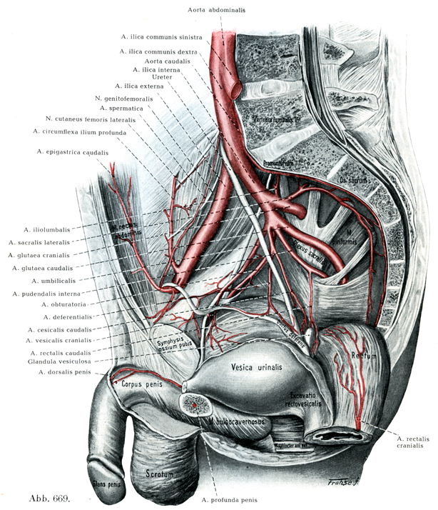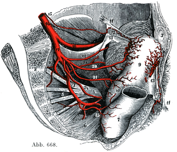 前立腺枝はたいてい1本の共通の幹を作っており,他側の同名枝とつながっている.女では同じような枝が腔にいく.少数の細い枝が恥骨結合の後面にも広がっている.