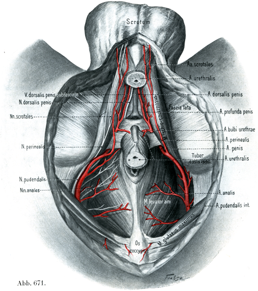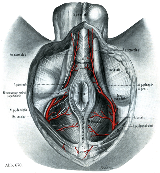 この動脈は尿生殖隔膜の後縁またはこの隔膜の内部で1本の枝を前内側に向かって送りだしている.すなわち