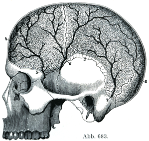 ふつう前頭部と後頭部にはそれぞれ1本の小幹が各側にあり,頭蓋の側方壁にはそれぞれ2本ないし3本の小幹が認められる.詳細についてはその走り方が個体的に変化を示し,また同一個体の両側についても多少の不同がある.