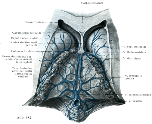 ζ. 内大脳静脈Vv. cerebrales internaeは第三脳室脈絡組織のなかにある.大脳の深部にある大きい灰白質塊からの血流を導きだしている.室間孔のところで視床線条体静脈Vena thalamostriataと脈絡叢静脈Vena chorioideaとが合してできる.視床線条体静脈は分界条の下で尾状核と視床核の境にある.そしてこれらの2つの大きな核からの血液を集めて,透明中隔のところで透明中隔静脈Vena septi pellucidiを受け入れている.脈絡叢静脈は側脳室脈絡叢の縁に沿って走り,このものからの血液を導き出している.左右の内大脳静脈はきれいな弯曲をなして脈絡組織のなかを後方に走り,そのさい近くの部分から来る多数の細い静脈を受けとる.内大脳静脈に入る最後のかなり太い枝が脳底静脈Vena basialisであって,脳の下面で始まり,大脳脚の周りをめぐってすすみ,レンズ核と灰白隆起からの静脈を受け入れている.