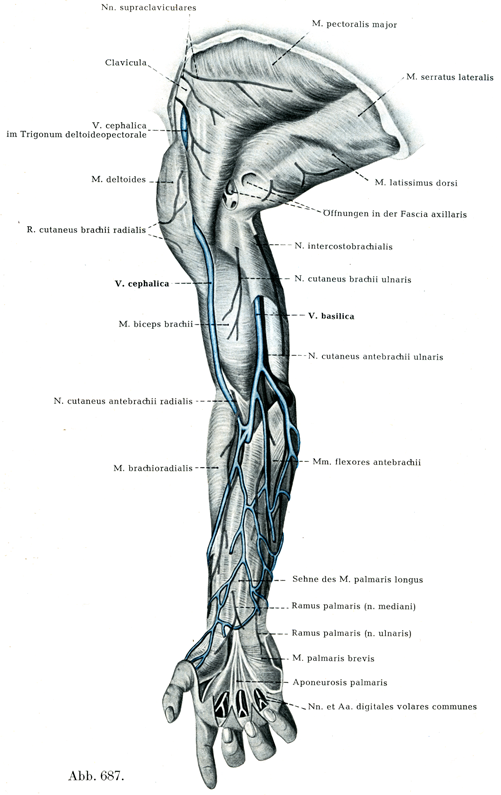 [図687] 右上肢(屈側)の皮静脈(Corning, topogr. Anatomieによる).