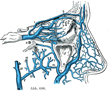 a視神経;b上斜筋;涙腺;d下眼球斜筋;e正円管;f上顎洞;I共通の幹;1前頭枝;2下眼静脈;3眼筋静脈と涙腺静脈;4上眼静脈と前後の篤骨静脈;5鼻前頭静脈;[6眼窩下枝];II顔面静脈;[7深顔面静脈];8,8外鼻静脈;9眼角静脈;10前頭静脈と眼角静脈との吻合;III下顎後静脈;IV側頭静脈;[V顎静脈];11中硬膜静脈;[12下顎静脈];13咀嚼筋からの静脈;14吻合;15翼口蓋窩.