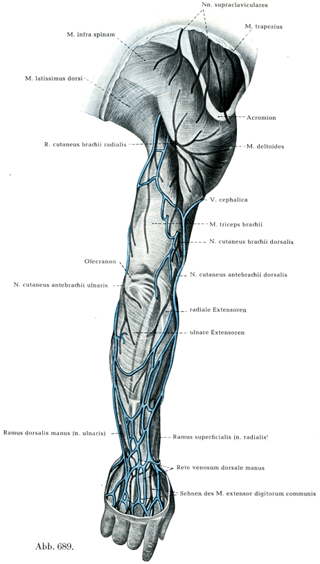 手では浅層の静脈が手背において数も多くて太いが,手掌では痕跡的であり細い.掌側ではほかの装置,つまり神経が特によく発達しているのである.したがって手に神経側Nerwenseiteと血管側Gefäßseiteを区別することができる.手の掌側面は圧力を多く受けるので,そのうちの1つの装置(神経)だけの発達には好都合であるが,もう1つの装置(静脈)の形成には都合がわるい.そのため指と中手と手根の背側には豊富な静脈網が広がっており,これを手背静脈網Rete venosum dorsale manusという.